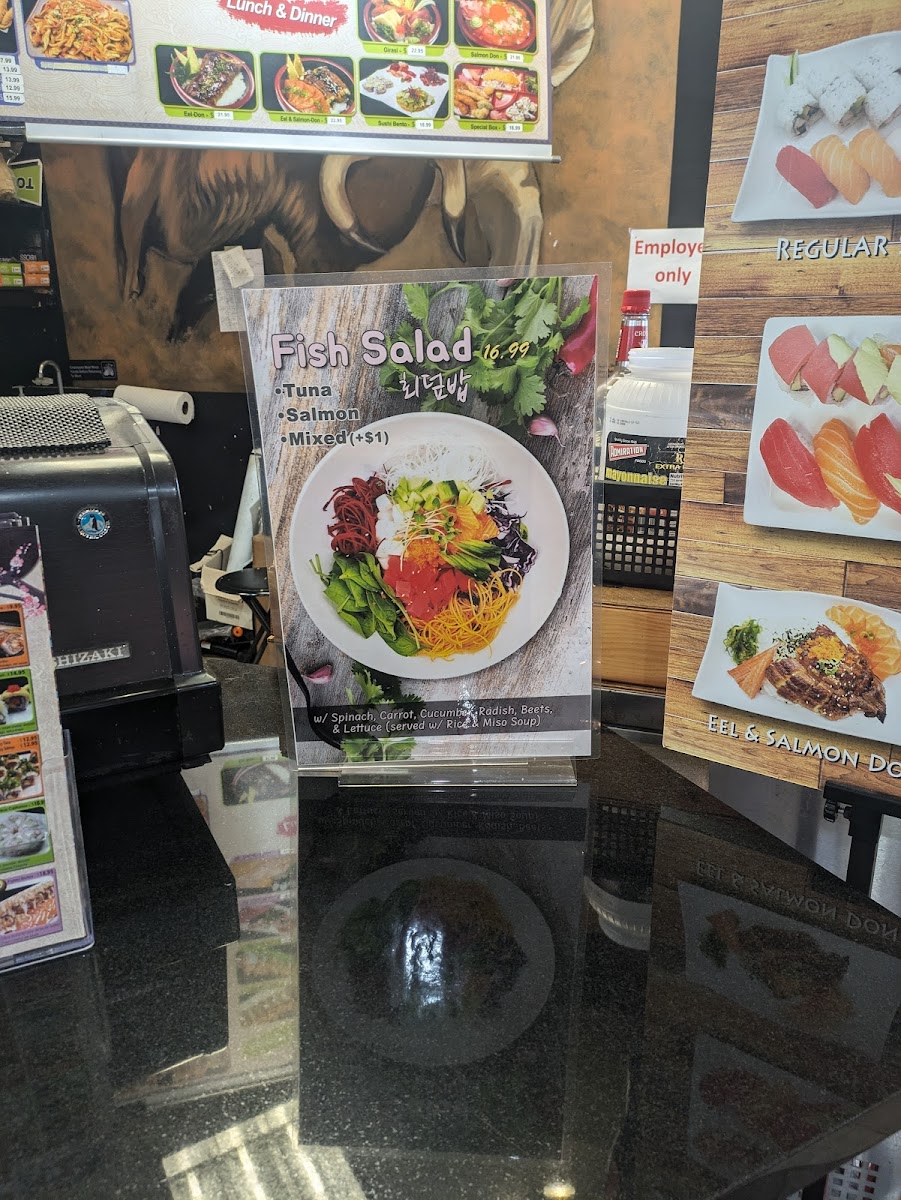 Salad topped with diced tuna, salmon, white tuna, sesame oil, imitation crab, and homemade spicy sauce.